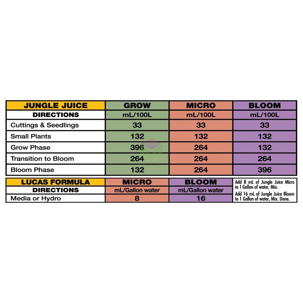 Toate componentele se utilizează împreună pe parcursul întregului ciclu de cultivare. Mai întâi, adăugați componenta Micro la apă și amestecați bine. Apoi adăugați treptat componenta Grow și în final componenta Bloom. Dozarea tuturor celor trei componente Jungle Juice poate fi la fel, dar puteți alege și o altă combinație conform calculatorului producătorului, care corespunde tipului de cultură crescută.