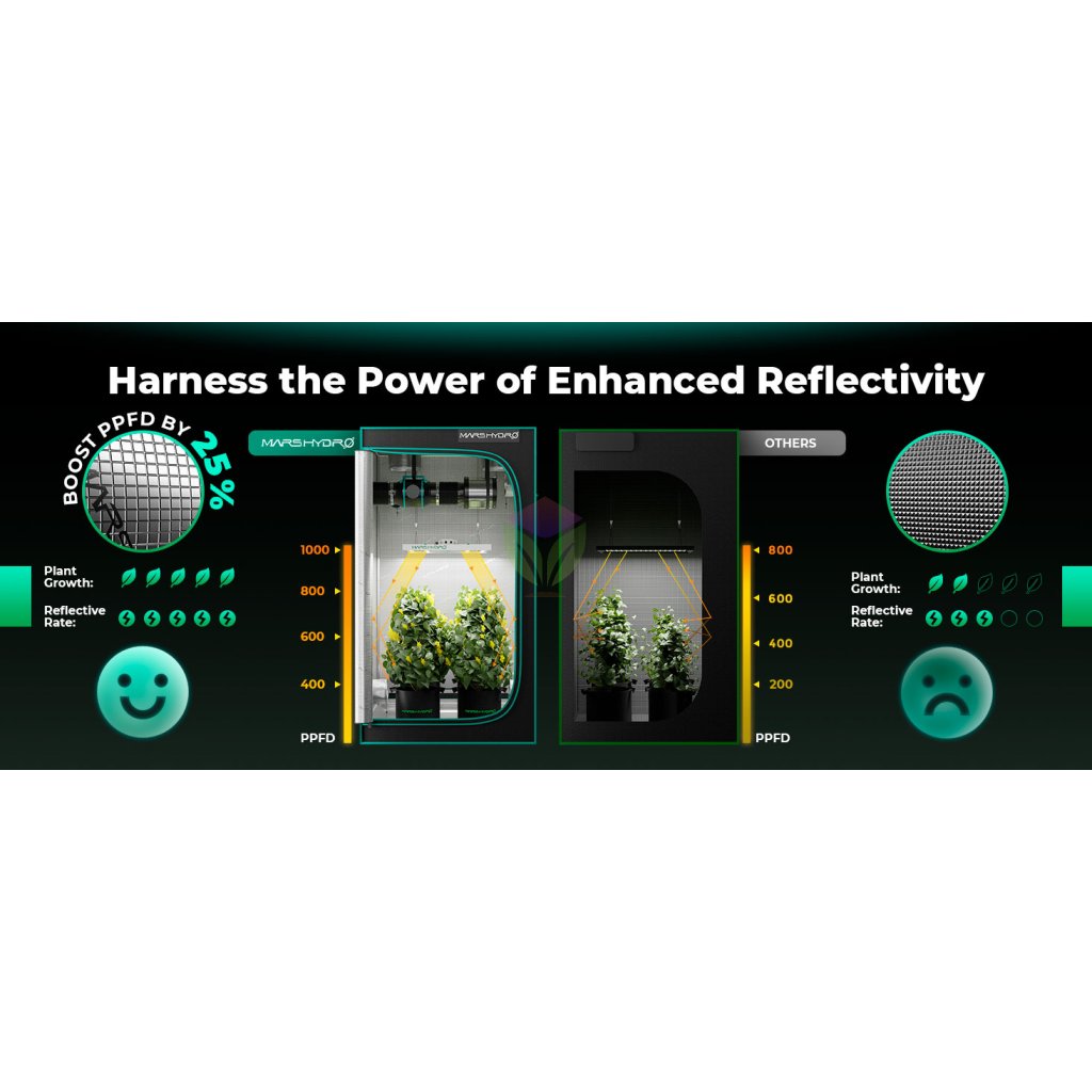 Interiorul cortului de cultură Mars Hydro oferă o reflectivitate ridicată datorită utilizării materialului diamond mylar. Materialul special de protecție plasat între fermoar și pânză previne orice leak de lumină. Țesătura dublă, cu o densitate de 1680D, asigură o închidere perfectă a luminii în interior și rezistă la rupere.