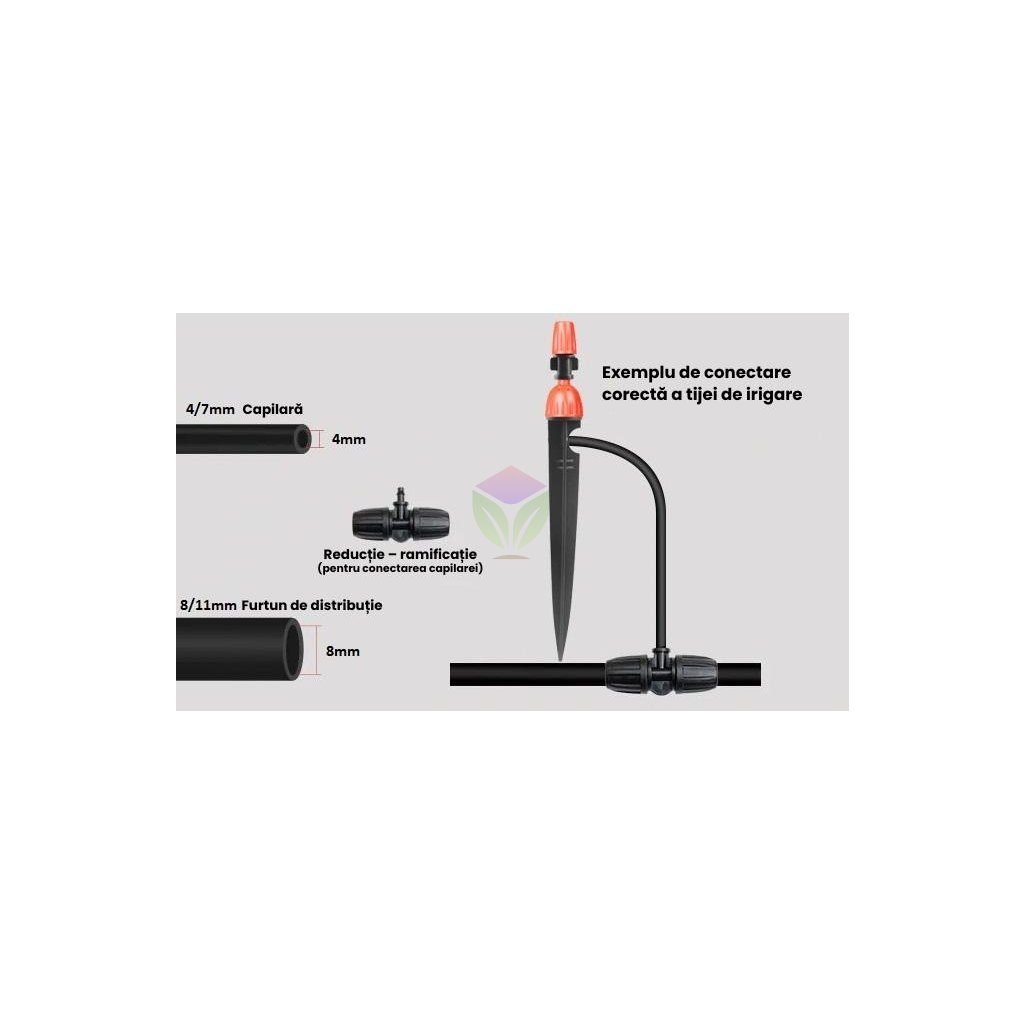 Sistem de irigare pentru straturi de flori, ghivece sau părți locale de gazon vă va ușura munca în grădină și vă va economisi timp. Achiziționați un sistem complet de irigare gata de utilizare. Produsul combină irigarea prin picurare cu pulverizarea fină a mediului înconjurător. Setul include un furtun cu diametrul 8/11mm și capilar cu diametrul 4/7mm. După cum sugerează denumirea componentelor, este vorba despre irigare capilară, pe care o puteți ajusta conform dorințelor dvs. prin duza reglabilă.