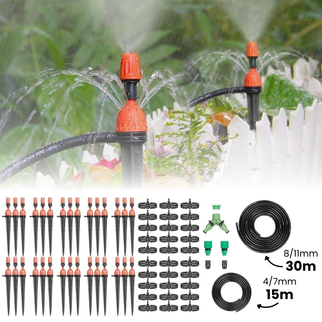 Sistem de irigare cu țăruși pentru sol este folosit cel mai frecvent pentru udarea gazonului, ghivecelor exterioare și a straturilor de flori sau doar pentru udarea solului într-o seră. Acest set conține 30 de țăruși pentru sol cu duză dublă superioară, 30 m de furtun de distribuție și în total 15 m de furtun capilar. Potrivit pentru instalații de irigare în grădină în timpul primăverii și verii.