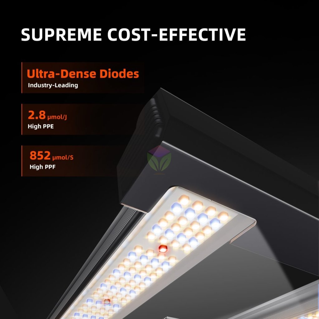 1 × G3000 300W Lampă LED cu spectru complet: Această lampă LED este versiunea cea mai recentă pentru 2024 și este echipată cu diode de la brandul american Bridgelux. Gama G se caracterizează prin cea mai mare densitate de diode LED din gama noastră, oferind o penetrare excelentă a luminii și acoperire uniformă. O densitate mai mare a diodelor LED înseamnă și o încălzire mai redusă și o funcționare mai eficientă, obținând rezultate mai bune cu un consum de energie mai redus.